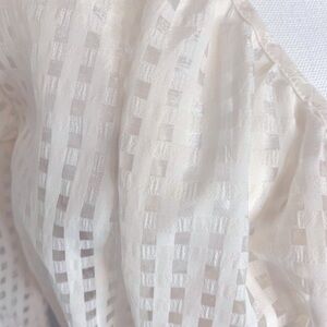 Crème color with sheer mesh squares that have a shimmer to them. Wraps and ties at the side. Has snap closure and also a button inside on the waist. Extra button still attached.