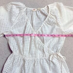 Crème color with sheer mesh squares that have a shimmer to them. Wraps and ties at the side. Has snap closure and also a button inside on the waist. Extra button still attached.