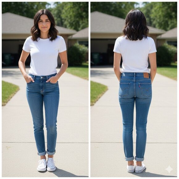 This listing is for a pair of authentic Levi's Boyfriend style jeans in a classic medium wash. These jeans are designed for a relaxed, comfortable fit that is roomy through the hip and thigh. The style features a slightly tapered leg that hits at the ankle, making them perfect for cuffing.