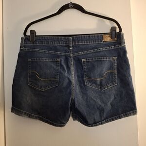 Levi's women's distressed denim shorts in a timeless blue with embroidered back pockets and rolled cuffs. Perfect for everyday wear. Durable and stylish. Size 12. waist side to side measures 18 inches. Length 15 inches.