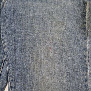 Small pink stain near upper thigh. Distressed patch on front left pocket.