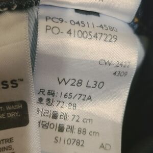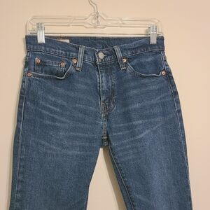 Women's dark wash, distressed, skinny jeans by Levi's, waist size 28. Jeans have five pockets. Cotton and polyester blend. Small hole on left knee; slightly distressed throughout, by design. Excellent pre-owned condition; no flaws.