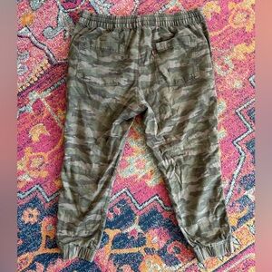 Levi’s | Women’s green camo Off Duty Joggers. Ankle length, elastic waist and hems, side and back pockets, drawstring at waist. Machine wash cold, 59% cotton, 38% viscose, 3% elastane. Women’s size L