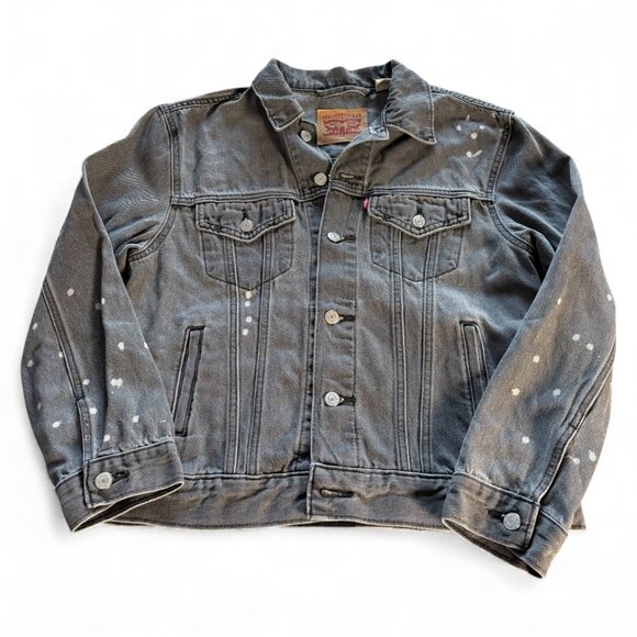 Classic Levi's denim trucker jacket. Often referred to with names Paint Splatter or Happy Accident. Grey stonewash look with unique white splatter paint design. Features classic Levi button-up design. Ideal for casual outings.