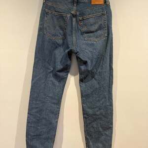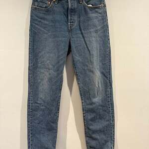 Levi's 501 Wedgie Tapered Jeans for women, featuring a classic medium wash denim. These jeans are designed for a flattering fit, cinching at the waist and tapering down the leg. Excellent pre-owned condition with no significant flaws. Perfect for a casual everyday look or dressed up for a night out. Iconic "Big E" red tab for authenticity.