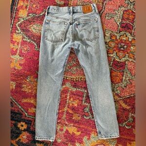 Levi’s | Women’s light blue distressed denim Premium Skinny 501 jeans. Buttonfly, front and back pockets, cute! Machine wash cold, 100% cotton. Women’s size 25