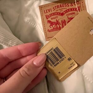 Chic Levi's jean jacket with cozy sherpa collar. Light green hue. Ideal for layering.