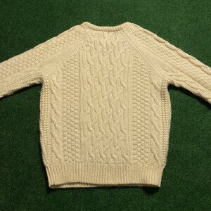 - The cream-white, long-sleeve, pull-over, crew-neck, chunky-knit sweater features a fisherman’s style knit and elastic trim