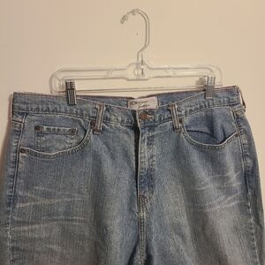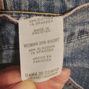 Women's medium rinse, mid rise distressed shorts by Levi's, size 20W short. Fabric: polyester and spandex. Five pockets; button and zipper closure. Excellent pre-owned condition overall; these were jeans cut into shorts and have raw hems.