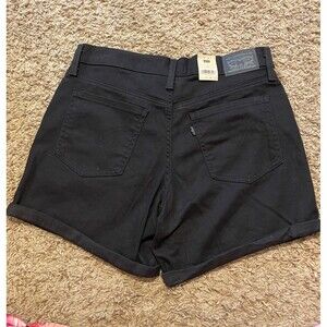 The product is a pair of brand new Levi's Women's Mid-Length Black Denim Jean Shorts in size 30. These shorts feature a zip closure, are made of black cotton denim fabric, and have a regular fit. They are designed for a casual occasion, have a 5-pocket design, and are machine washable. Perfect for the summer and spring seasons, these shorts also have a flat front and are branded by Levi's, making them a stylish choice for any woman's wardrobe.