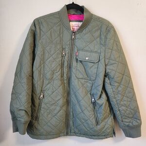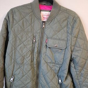 Keywords: Levi's jacket, quilted bomber jacket, womens jacket, olive green jacket, lightweight jacket, casual jacket, bomber jacket, pink lining, womens outerwear, fall jacket, spring jacket, diamond quilted, Levi's womens