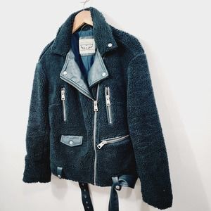Oversized all over sherpa moto jacket with attached faux leather belt