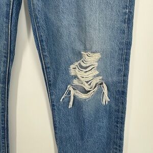 One hole/distressing at the knee and a little distressing at the pockets, straight leg, 28" inseam
