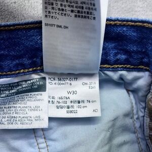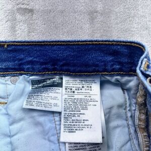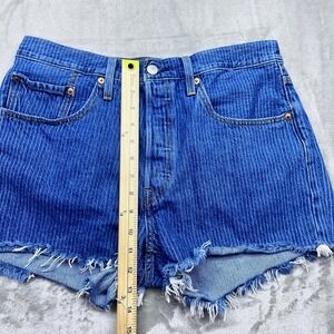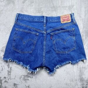 Keywords: Levi's, denim shorts, high waisted, striped, frayed hem, women's shorts, size 30, button fly, casual, summer, festival, blue denim, vintage inspired, trendy shorts