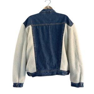 Levi's Pieced Sherpa Ex- Boyfriend denim trucker jacket. Jacket is cream sherpa and denim with a snap up front. It's made of 100% cotton and is a woman's size large.