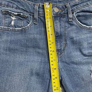 Levi's Women's 726 High Rise Flare Jeans, W27 L32. These stylish distressed jeans feature a high-rise waist and a classic flare leg, perfect for a vintage-inspired look. Excellent pre-owned condition with factory distressing and a patched knee detail.