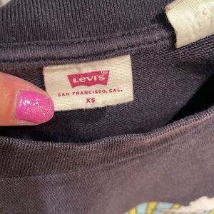Women’s size XS black sweatshirt from Levi’s. Colorful mushroom motif, boxy cut. The black is lightly washed and the mushroom picture is perfect (not peeling, cracked, fading etc) overall great condition.