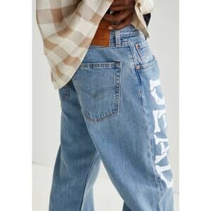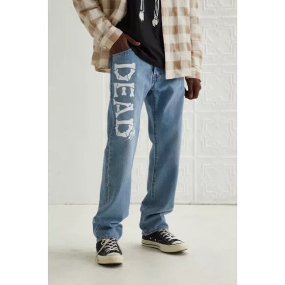 Upcycled denim jeans by Levi’s featuring a Grateful Dead print at the leg. Classic 5-pocket style in a straight leg silhouette & finished with a button and zip closure to the front.
