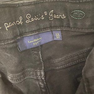 Levi's black low skinny jeans with hole in left knee. Size 12M/31. 99% organic cotton, 1% spandex. Smoke free, pet friendly home.