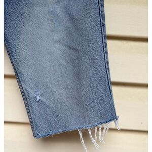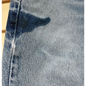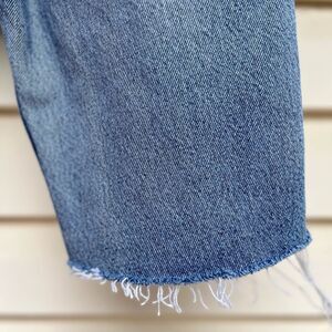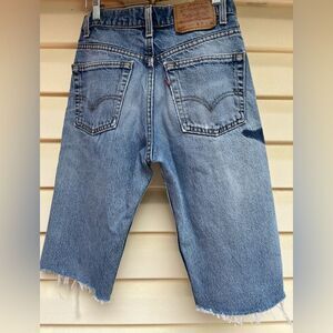 Levi’s blue long shorts are stylish and feature a distressed, washed-out look with a unique blue streak along the side. They come with a fly closure and the signature Levi’s red tag. They are in good condition and are sized W29L34.