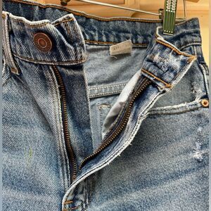 Levi’s blue long shorts, distressed, side blue streak, zip fly closure,W29L34