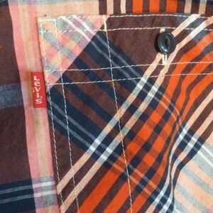 Levi's button down plaid short sleeve shirt - orange navy blue - 2 pockets - XXL