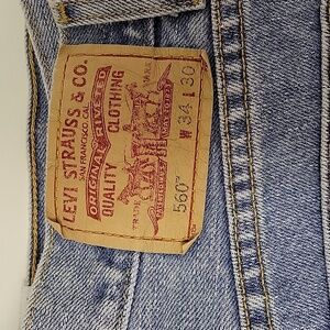 discontinued Levi's 560 comfort fit relaxed jeans sz 34 x 30. 100% cotton. small spot on left front (pictured).