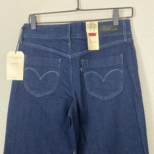 Levi’s dark wash double button wide leg. solid dark wash. New with tags. High-rise. Waistband measures 14 1/2 inches resting stretches 216 inches across. Rise measures 10 inches. Inseam measures 34 inches.