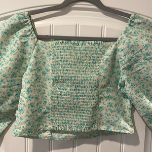 Size medium. New with tags bust darts. Measures 17 inches across from under arm to under arm. Measures 14 1/4 inches from shoulder to bottom of the top. Dips slightly lower in the middle on the front of the blouse. Measures 11 and three-quarter inches from the front neck line to the bottom of the blouse. Sleeve length from under arm to end of sleeve is 11 inches.