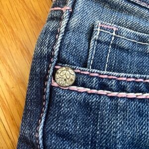 Levi’s girls boot cut jeans. Beautiful pink stitching. Size 6x. Hook waist with zip fly. Button pocket in back. Excellent condition.