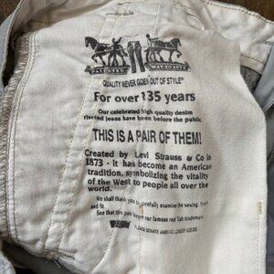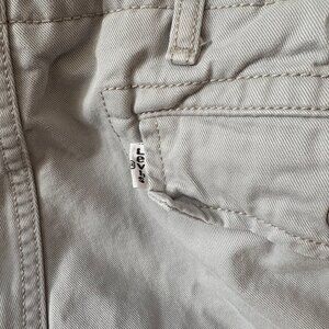 Gray-tan cotton cargo shorts from Levi's. No size or material tag. Waist measures roughly 18 inches when flat, the rise is 12 inches, and the inseam is 10 inches. Nice heavyweight cotton with multiple pockets that button closed. Good basic.
