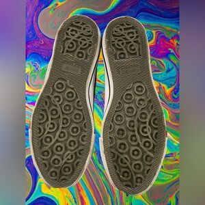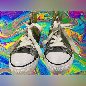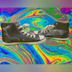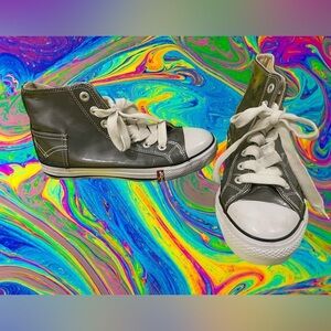 Levi’s high tops. Women’s size 8.5. Patent leather color, silver. These shoe have flare! They are fun and definitely sparkle and shine where ever you go