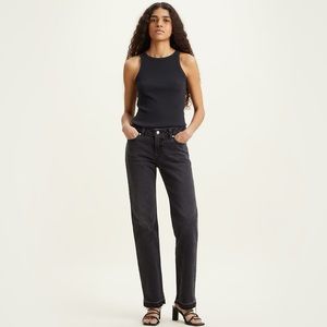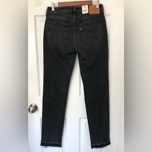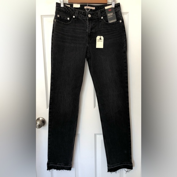 “Worn in Black” Levi’s Low Pitch Straight jeans. Fitted through the hip and thigh. Mid- Low rise. Straight leg. 5 pocket styling. Zip fly. Cut off style hem at bottom of legs. Small 1-2 inch slit up side seam. Size 28X33. Made of 99% Cotton, 1% Elastane. New with tags.