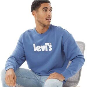 The Levi's Men's relaxed graphic sweatshirt in sunset blue, size medium, is a stylish and comfortable pullover sweatshirt perfect for the colder seasons. Made from a blend of polyester and cotton, the fleece fabric gives it a cozy feel. The crew neckline and long sleeves make it a classic choice for men who enjoy casual wear. The relaxed fit and logo accents add a touch of branding to the garment, while the solid blue color and graphic print give it a trendy look. Easy to care for with machine washable instructions, this sweatshirt is ideal for activities such as gym training, walking, or running.