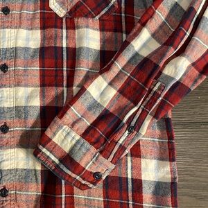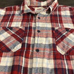 Levi’s plaid flannel. Size L. Red/cream/blue. Button down. Long sleeve. Collar.
