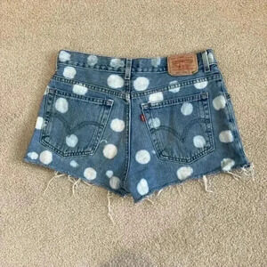 Levi’s relaxed fit 550 polka dot high rise shorts in size 29. In good used condition but does have some extra white bleach marks.