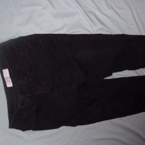 size 10 Long womans black jeans denim pants has pockets button up zipper front broken in fabric has stretch to it style no rise straight logo on back