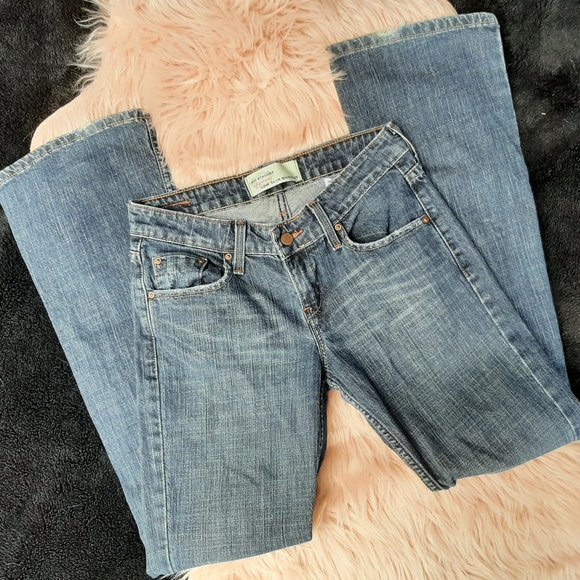 Levi's Low-Slim-Bootcut- Stretch. Size 7 Medium, Waist measured flat is13" across, hips 17", front rise 8" and inseam is 30". Classic medium wash denim, A little fray at the back bottom legs from buying for heels and wearing without : ) - very good preloved condition. Quality Denim - Bundle and Save!