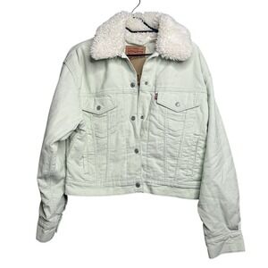 Classic Levi's denim jacket with a warm sherpa collar. Dark blue denim for a timeless look. Perfect for layering in cooler weather.
