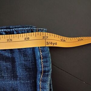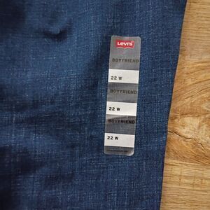 The product is a pair of Levi's women's boyfriend distressed mid rise jeans in size 28W with a 27" inseam. These stylish jeans feature a solid blue color with a medium fabric wash, made of durable denim fabric. The relaxed fit and mid-rise feature gives them a comfortable and trendy look, perfect for everyday wear. The jeans are accented with a button, zipper, and Levi's logo, adding a touch of style to the classic design. Ideal for women looking for a fashionable and versatile addition to their wardrobe.