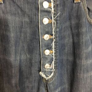 Denim dark wash button fly men's jeans. Slightly distressed. Front and back pockets. Straight leg relaxed jeans. Pre-owned in good condition. Please refer to pictures for best description and condition verification.