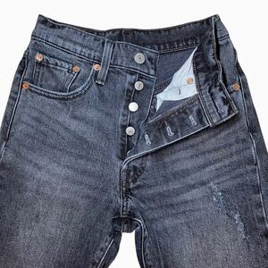 Levi’s, black, distressed, raw hem, skinny, button fly, straight leg, high rise, high waist, high waisted, stretch, casual, comfortable, fitted, form fitting, sustainable, eco friendly