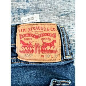 Medium blue 505 straight leg regular fit denim jeans from Levi's. Zip fly, classic 5 pocket styling. Levi's signature logo patch on back waistband. Great condition.