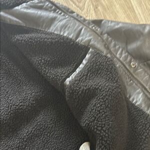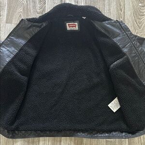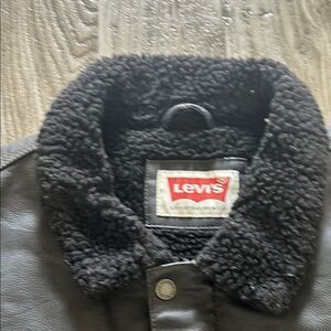 This is a Levi's Black Faux Leather Sherpa Lining Trucker Jacket.