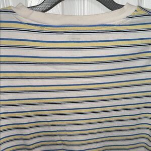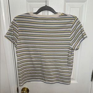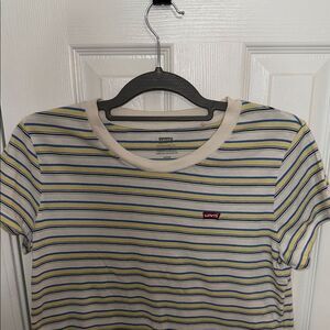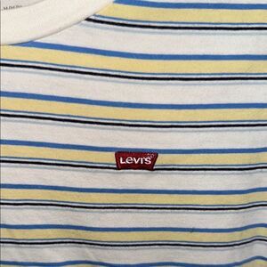 Stylish Levi's tee with blue and yellow stripes. Features a comfortable crew neck. Stripes all over