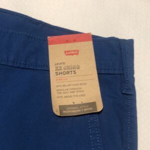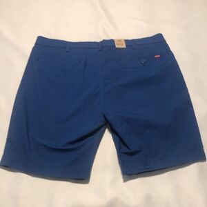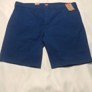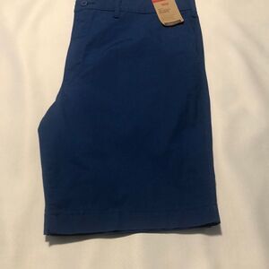 This is brand new with tags. The fabric is 98 % cotton, 2 % elastane. The length from top to bottom is 21 inches. Zip fly. The color is royal blue.