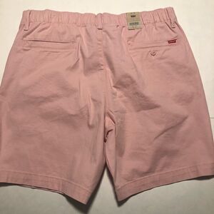 This is new with tags. The fabric is 98% cotton, 2% elastane. The inner drawstring waist is 36 inches stretches to 40 inches. The length from top to bottom is 19 inches. Mens size large. The color is pink. Zip fly, button close.