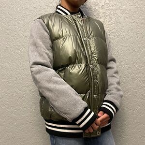 Levi’s, retro, puffer, olive green, bomber jacket, old school, 90s, pilot looking jacket, fleece, soft, lightweight, filled jacket, quilted oversized cloud jacket