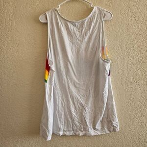 This is a relaxed fit tank top by Levi's. It is white with a large rainbow print and a small rainbow tag near the hem.