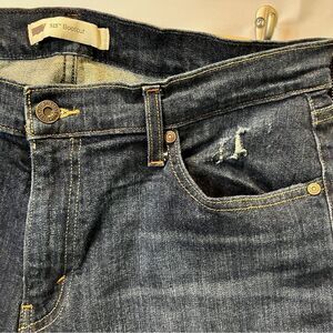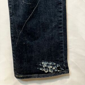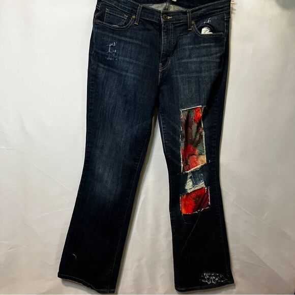 Distressed dark wash iconic Levi’s jeans with floral patchwork and custom distressing. The more you wash the prettier the distressing will get and become your favorite new jeans.